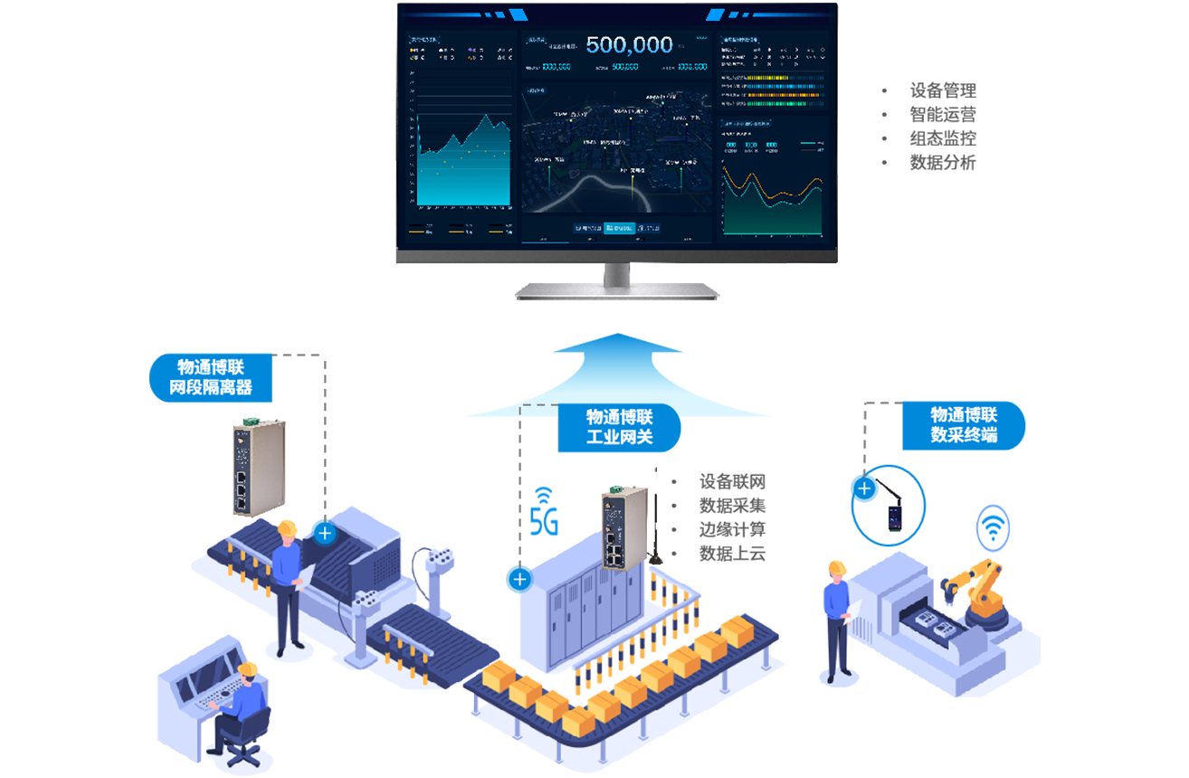 借助long8龙8国际的工业智能网关,实时采集工厂各类设备的运行数据,如运行状态、温度、压力、转速等,将采集到的数据传输至设备管理平台,进行设备资产档案管理、运行管理、工单管理、采购管理、备件管理、维修管理、数据分析等,实现设备全生命周期管理。