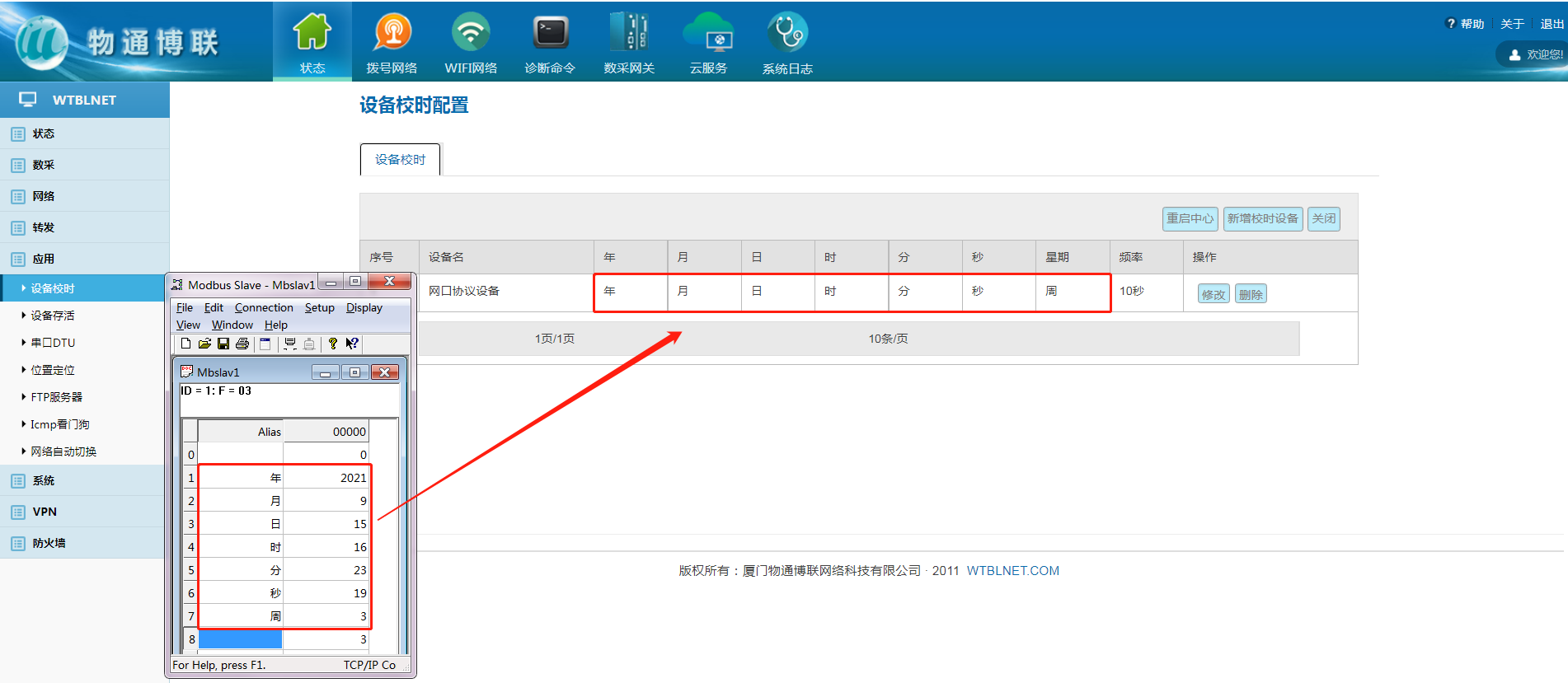 注:截图使用Modbus Slave软件模拟需要校时的设备。