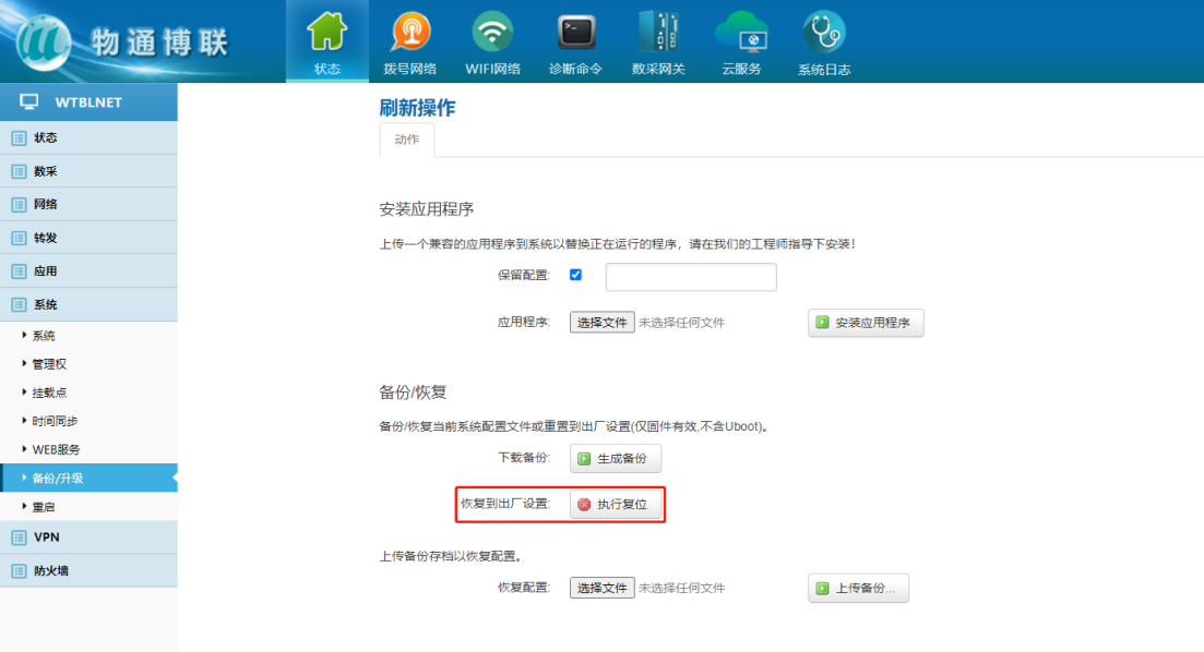 下载中心 视频中心 常见问题 售后服务 工业网关 设备快线 数据云平台 联网设备 问答百科 工业智能网关如何进行软硬件复位? 时间:2022-10-26 09:13:38 点击:5898 关键词:工业智能网关,网关复位,网关重启 问题:工业智能网关如何进行软硬件复位? 回答: (1)硬件复位 第一时间断电后再通电重启设备网关,当网关指示灯STATUS和WARN交替闪烁后,立即长按RESET键,直到ERROR灯慢闪后松开(或3秒后松开),再次长按RESET键,直到ERROR灯快闪后松开按钮(或3秒后松开),网关开始复位 (2)软件复位 系统——备份/升级——恢复到出厂设置 上一篇:工业智能网关如何设置静态固定IP? 下一篇: 工业智能网关和DTU有什么区别吗?