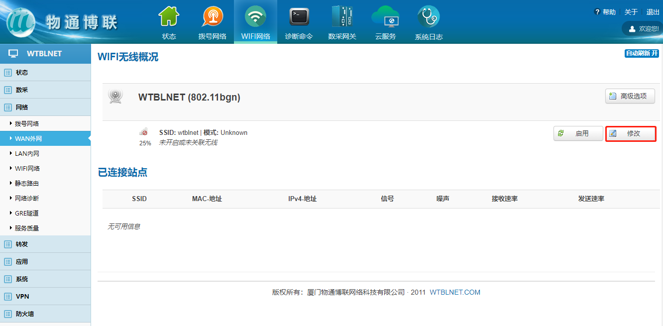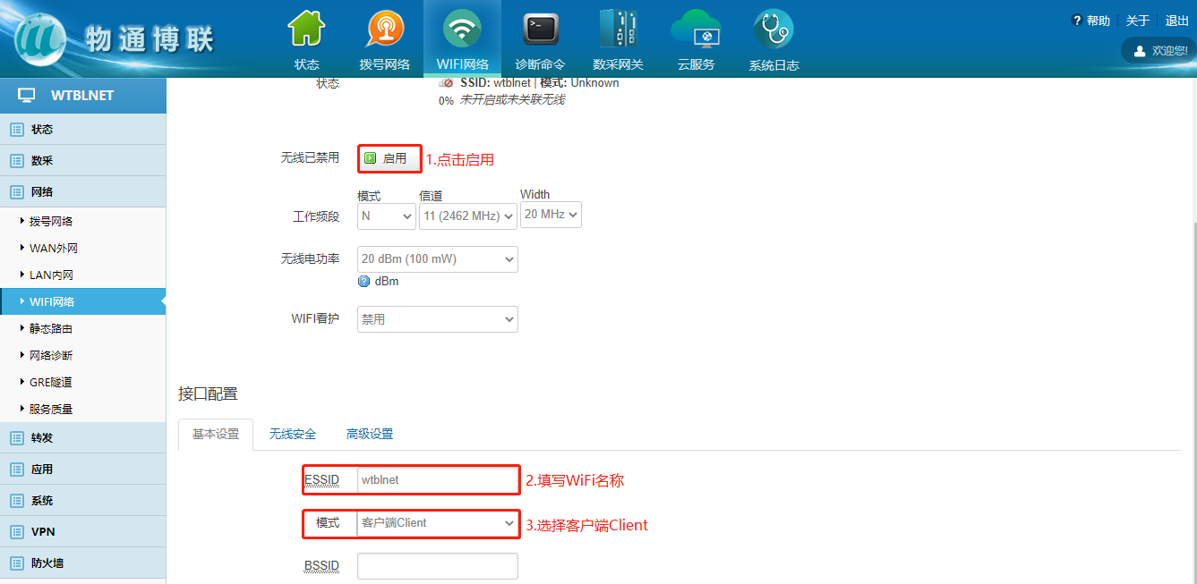 下载中心 视频中心 常见问题 售后服务 工业网关 设备快线 数据云平台 联网设备 问答百科 工业智能网关如何连接wifi热点? 时间:2022-10-26 09:15:30 点击:5513 关键词:工业智能网关,wifi 问题:工业智能网关如何连接wifi热点? 回答: (1)电脑顺利获得网线接入到网关LAN口,浏览器输入192.168.2.1默认地址 (2)登陆网关配置界面选择WiFi网络 (3)点击WiFi界面修改—进入WiFi配置界面 (4)启用WiFi—填写ESSID(WiFi名称)—模式选择客户端Client (5)点击无线安全—输入WiFi密码 注意:WiFi获取到的IP网段与网关LAN口的IP网段不能重复! 上一篇:工业智能网关如何更新程序和固件? 下一篇: 工业智能网关如何使用流量卡上网?