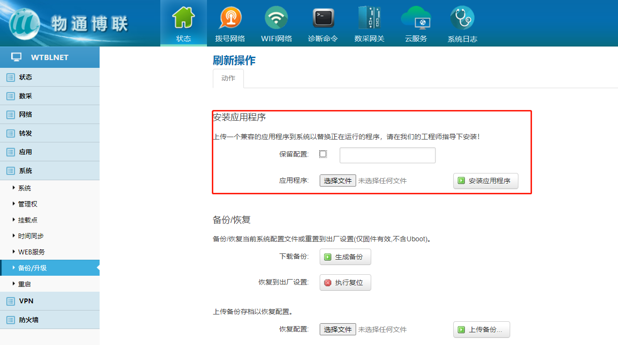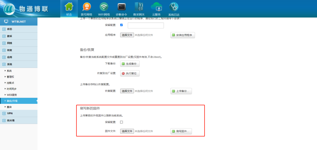 下载中心 视频中心 常见问题 售后服务 工业网关 设备快线 数据云平台 联网设备 问答百科 工业智能网关如何更新程序和固件? 时间:2022-10-26 09:39:53 点击:5339 关键词:工业智能网关,网关配置,固件升级 问题:工业智能网关如何更新程序和固件? 回答: (1)固件升级:后缀为。bin的文件 点击系统—备份/升级—选择文件—刷写程序(不保留配置) (2)IPK文件升级:后缀为。ipk的文件 点击系统—备份/升级—选择文件—输入密码—安装应用程序(不保留配置) 上一篇:工业智能网关时间如何进行同步? 下一篇: 工业智能网关如何连接wifi热点?