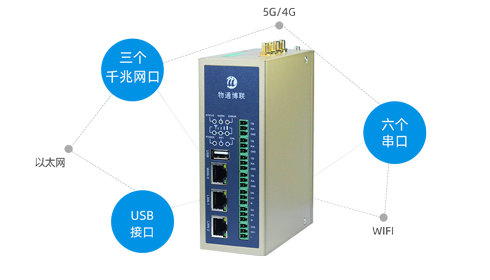 支持三个千兆网口、10个串口(485/232)、一个USB接口、支持5G、4G、双频WIFI、有线以太网等多种联网接入
