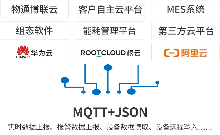 北向支持MQTT协议接入long8龙8国际云平台,客户自主开发的云平台,第三方云平台(根云、美云、华为、阿里、百度、微软等IOT云平台),组态软件、MES系统、ERP系统等工业软件