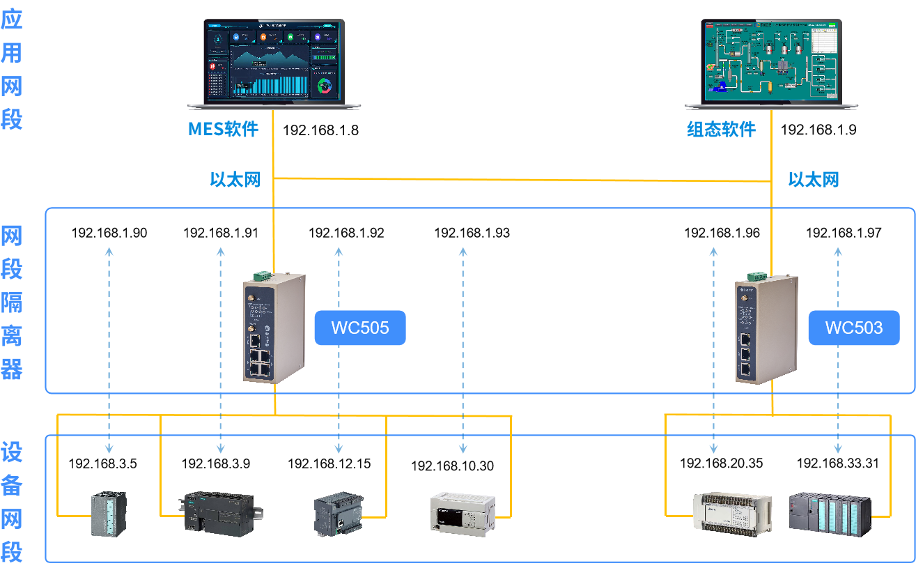 long8龙8国际WC系列网段隔离器适用于生产网络对 PLC、HMI、CNC、DCS、MES等网络通讯和数据采集,兼有跨网段隔离和IP转换的功能。车间多个设备,如果有不同网段的IP地址,则可以统一成同一网段的IP地址,进行设备(PLC、CNC)的在线编程、数据采集、远程管理等各种跨网段访问。