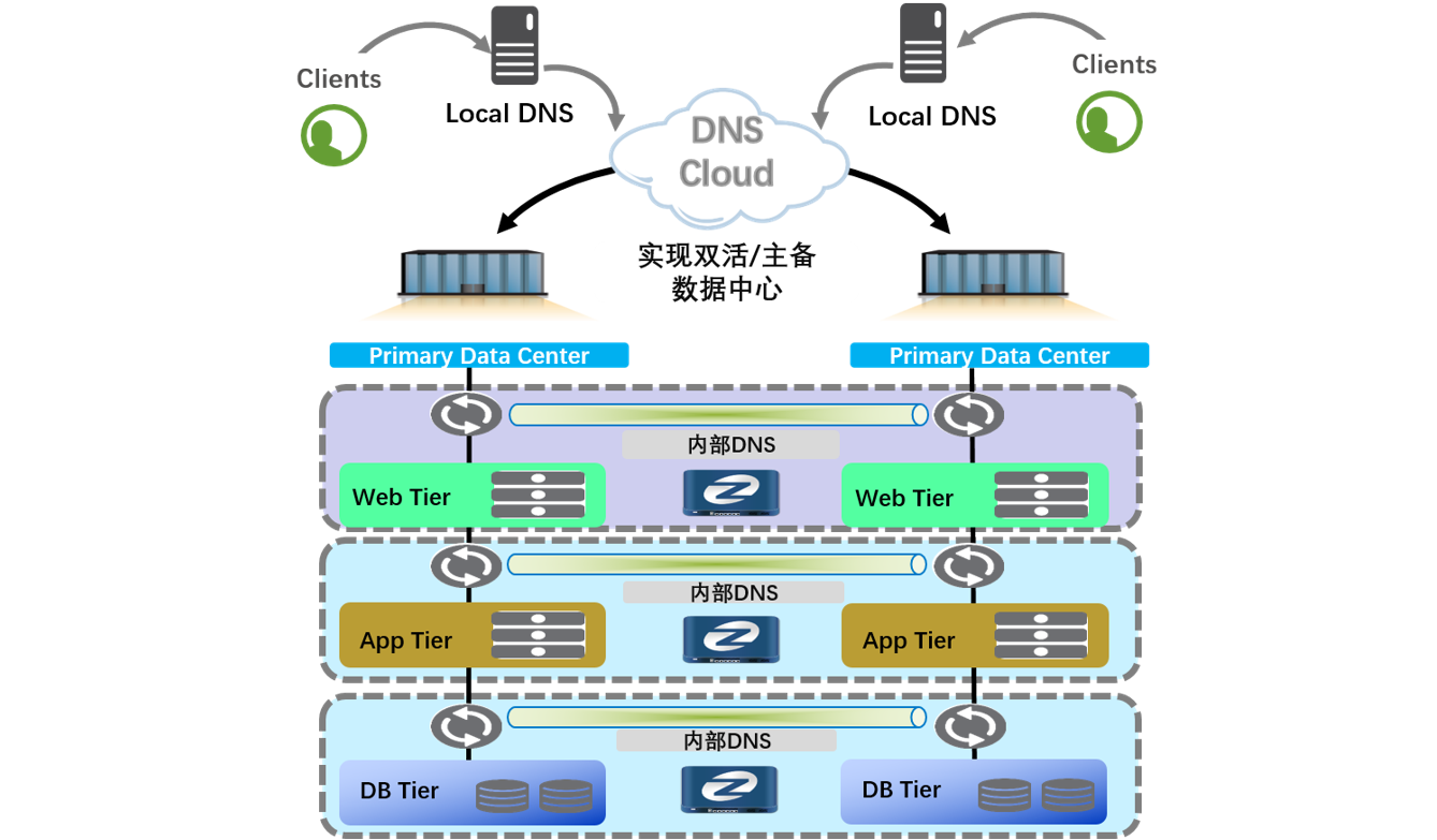 数据中心为提高应用系统的可靠性,实现多站点资源分布式部署,提高资源的利用率,需要多站点的应用系统构建成多活或主备工作模式。为了与IP地址解耦,通常会使用域名系统(DNS)来调度这些应用。long8龙8国际多数据中心域名(DNS)解决方案以IT整体架构为蓝图,以业务陆续在性保障为目标,利用域名解析门户应用调度功能,可将用户访问流量引流到可靠、可用的数据中心进行访问,既能保证用户的使用体验,又能达到应用容灾的无感切换的目的。