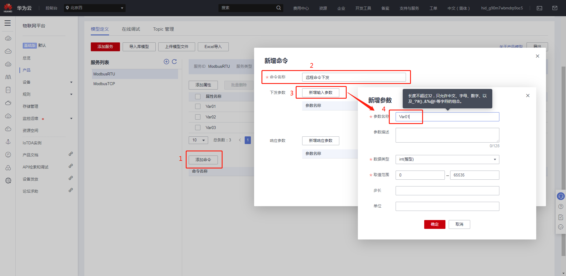 华为云反控设定:点击添加命令,定义命令名称,新增输入参数,建立需要下发写的参数,“参数名称”要与需要下发写的“属性名称”对应。