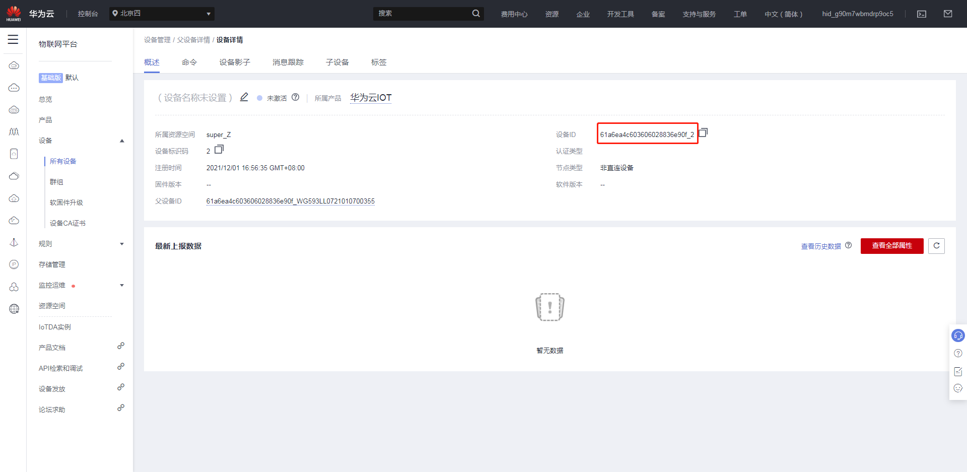 网关端“子设备序号”对应华为云IOT非直连设备的“设备ID”;
