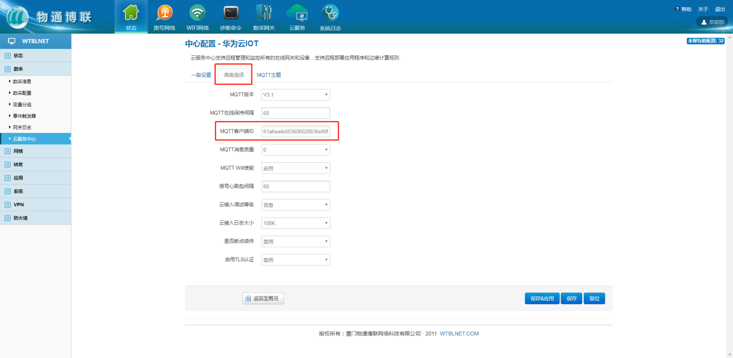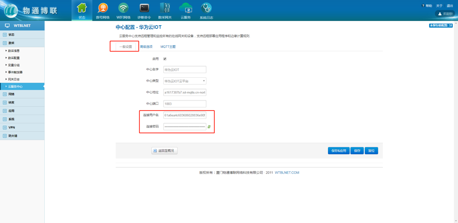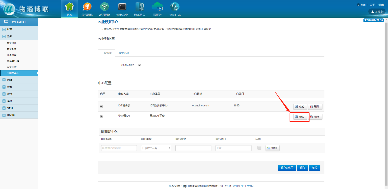在网关本地web界面内,左侧目录栏中选择数采,下拉框中的云服务中心来配置网关与华为云IOT的MQTT连接参数,中心类型选择华为云IOT平台,并勾选启用,点击添加。