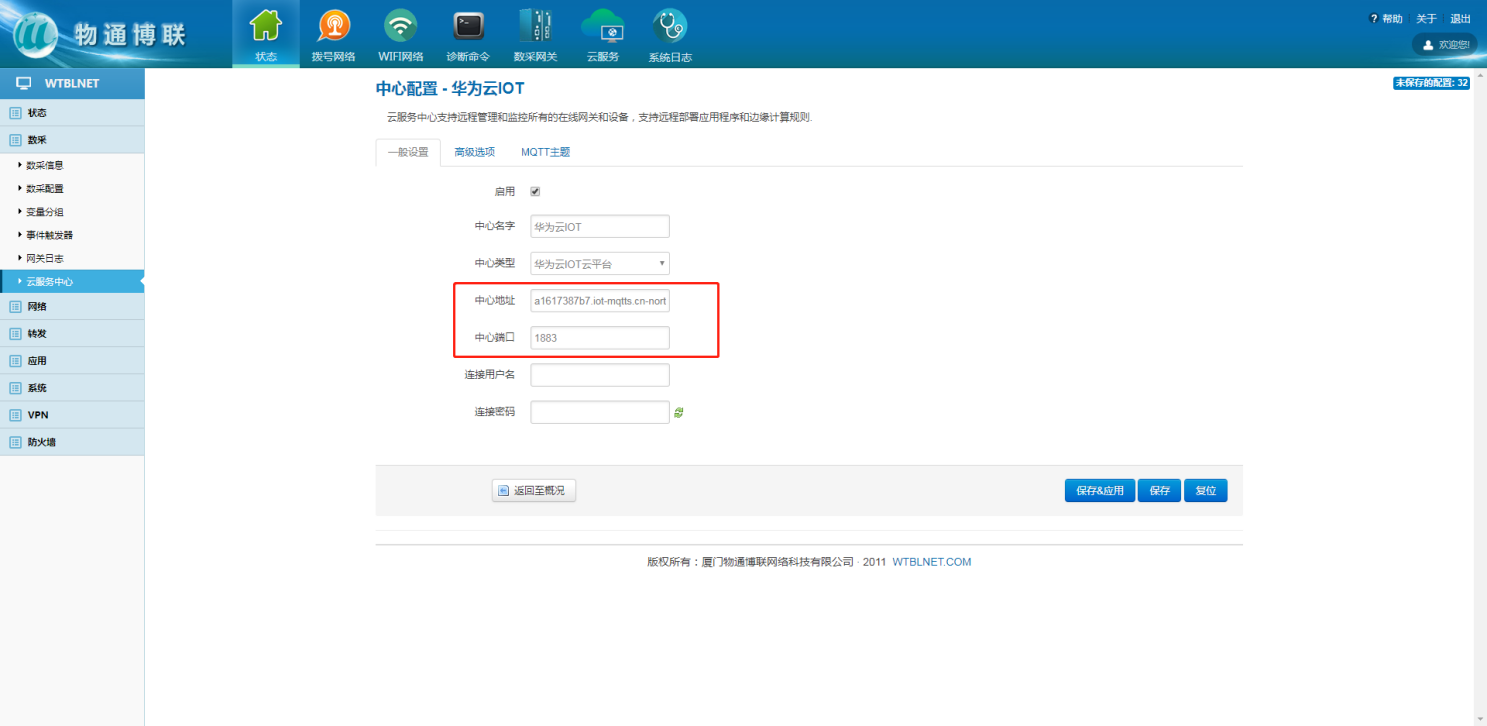 云中心地址在华为云IOT,左侧目录栏总览上的平台接入地址内,点击进入,相关MQTT连接的中心地址以及端口号复制到网关上。