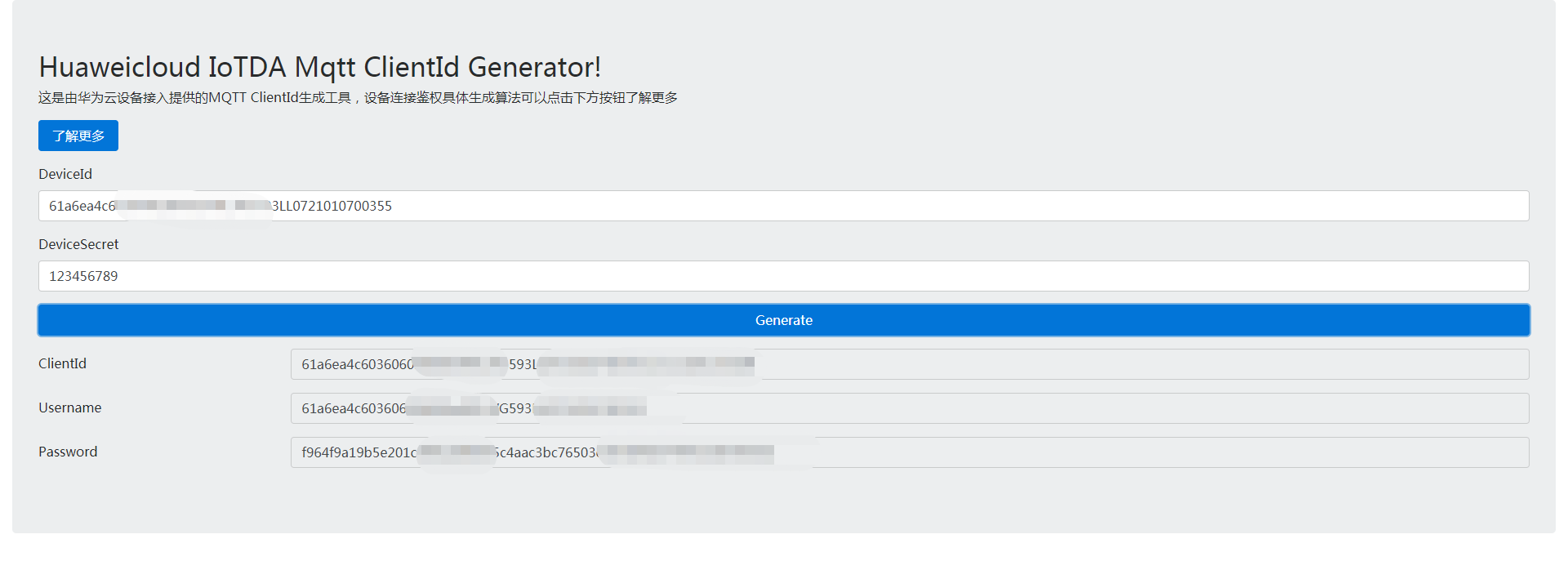 顺利获得以下链接生成连接所需的用户名、密码和ClientID:http://iot-tool.obs-website.cn-north-4.myhuaweicloud.com/