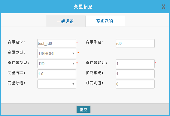 变量配置主要是定义变量名(自定义内容,不可使用中文命名)、变量别名(自定义,可使用中文名字)、寄存器类型和寄存器偏移地址,并定义一些数据规则(如:倍率、小数点、单位、告警)。