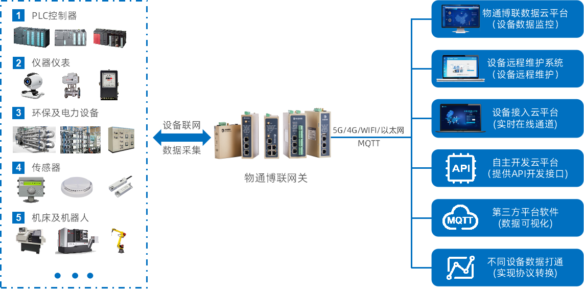 支持各种PLC、仪器仪表、机床、机器手臂、环保、电力等设备的数据采集,快速采集专利算法,同时采集多种设备内嵌主流的工控协议(Modbus TCP、Modbus RTU、OPC UA 、DLT645、IEC、PPI、MPI、ISO on TCP、EtherNET……),同时支持个性化的协议定制开发