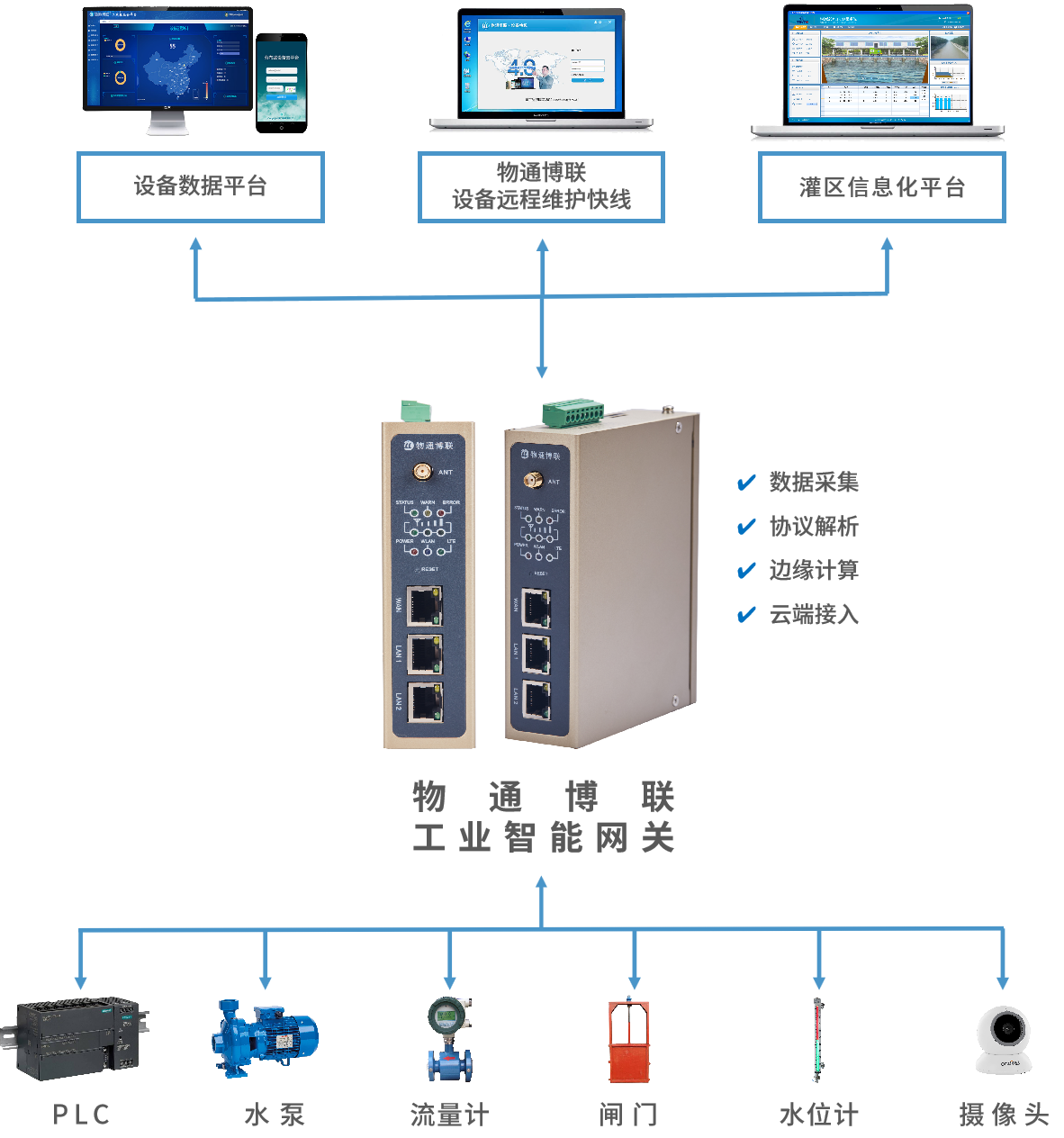 针对以上问题,long8龙8国际给予智慧灌区信息化管理系统的解决方案,顺利获得引入物联网网关,实现对农田灌区全方位、全过程的智能化管控。顺利获得将物联网网关接入到流量计、水位计、水质分析仪、雨量计、墒情传感器、闸控、摄像头等设备,进行数据采集并顺利获得无线网络传输到智慧灌区管理平台中,实现远程监控、远程管理、远程控制以及数据分析等多种功能,为建设智慧节水 灌区给予可靠高效的管理手段。