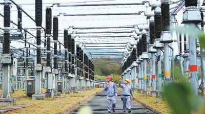 今年夏季,全国用电负荷快速增长,各地电力稳发满发。图为8月25日,在四川省达州市,技术人员巡查燃气发电公司厂区升压站。 邓良奎摄(人民视觉)