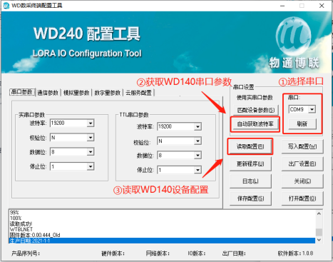 打开配置工具,选择相应的串口,点击“自动获取波特率”,获取成功后点击“读取配置”。
