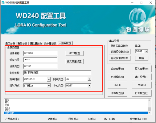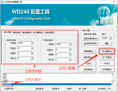 可以顺利获得配置工具修改WD140设备的串口参数以及通讯参数(相关配置的说明请继续阅读此文档),修改完成后点击“写入配置”,等待下方提示写入成功后即可。