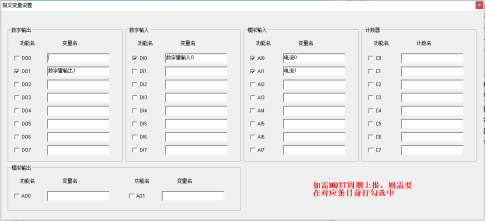 注:如果需要配置串口数据透传到MQTT服务器,只需要在上下行主题加入“trans”字样即可,主题中含有“trans”即代表网关为透传模式。配置好MQTT参数后,关闭子窗口,点击“报文变量设置”,可自定义变量名称,可按需设置需要上报的点位,在需要上报的点位名称前面打钩即可,如下图: