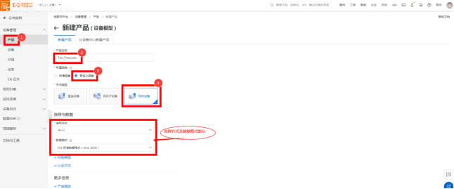 1、网关创建产品 提示:创建项目的名称定义(可根据实际场景),所属品类根据实际场景 选择节点类型选“网关设备”,连网方式及数据格式默认。详见图2