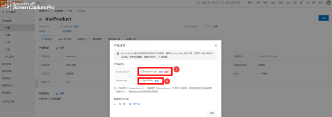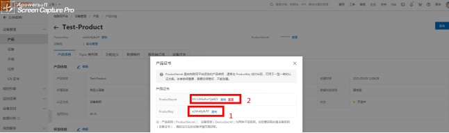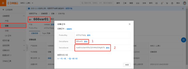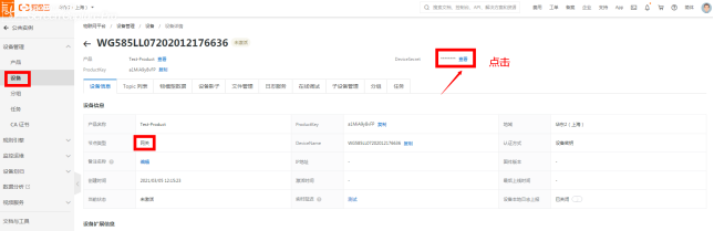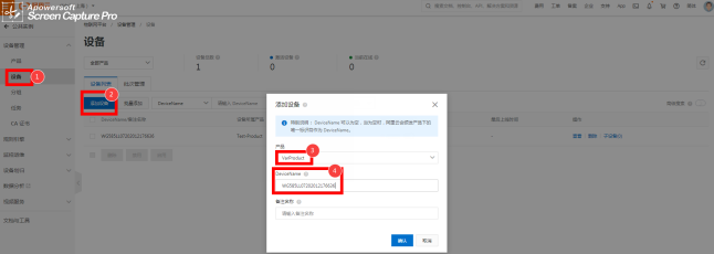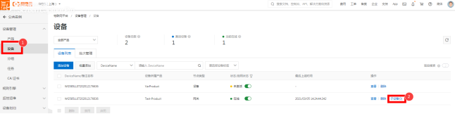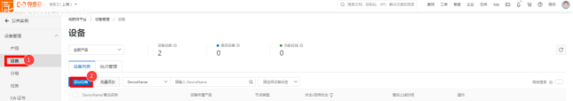 4、设备添加设备 项目生成后,点击“设备管理”选择“设备”,选取右边“添加设备”。 选择刚添加产品设备的名称,这里DeviceName填的是设备的名称定义(可根据实际场景)详见图2