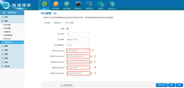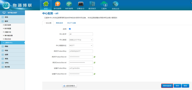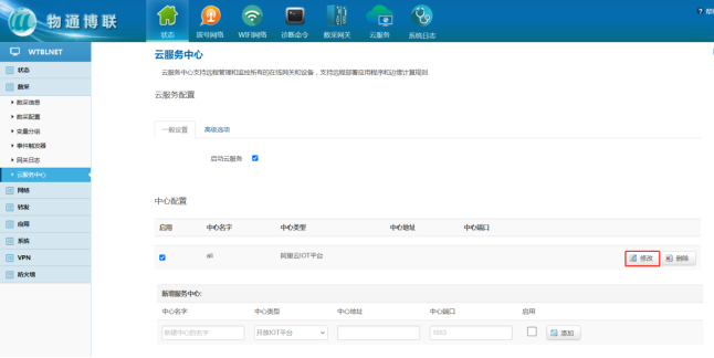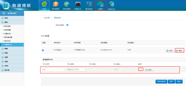4 网关界面云平台关联 1、云服务器参数配置 打开long8龙8国际网关WEB界面,可删除原有的服务中心,新建一个连接中心,中心类型选择阿里云IOT平台,启用√ 点击“添加” 保存应用
