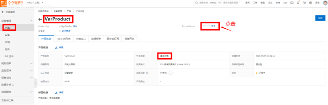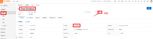 产品管理中点击“节点类型为网关设备”的产品