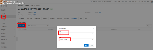 2、网关添加设备 项目生成后,点击“设备管理”选择“设备”,选取右边“添加设备”。 选择刚添加产品网关的名称,DeviceName请填写long8龙8国际对应项目网关的网关系列号,备注名称可以设置成跟产品相关的名称。详见以下图