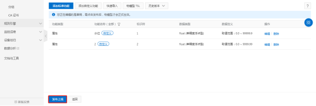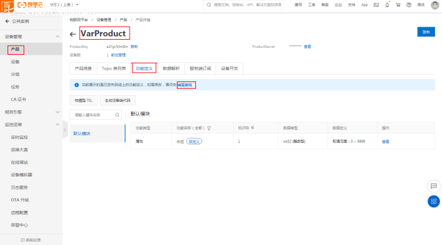 点击产品—节点类型为(设备)—查看—功能定义—自定义功能。(阿里云变量上限只能添加256个)