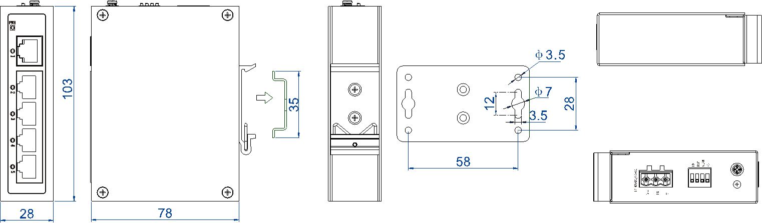 外壳:IP40防护等级,金属外壳 安装:DIN导轨式或壁挂式安装 尺寸(宽×高×深):28mm×103mm×78mm |