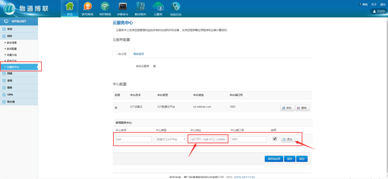long8龙8国际设备联网智能网关设备具有多种接口和通信协议支持,可以与各种设备进行连接和通信,如RS485、RS232、以太网口等,将网关和设备连接,顺利获得配置网关的数据采集规则,可以实现数据的实时采集和处理,对采集到的数据进行预处理和转换。在网关的云服务中心中添加百度天工IOT云平台,建立与百度天工IOT云平台的连接,并将采集到的数据上传到云平台。