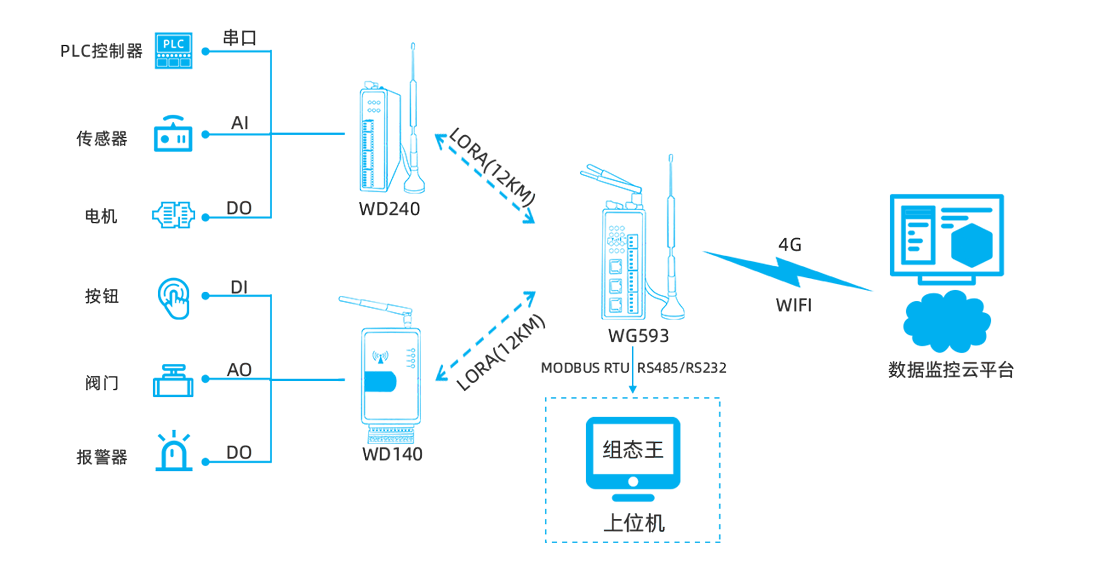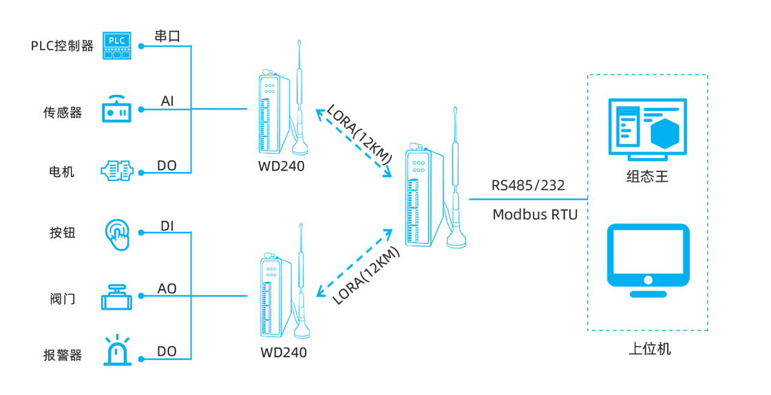 | 示例 | WD240-LM0844-485(8AI-4DI-4DO,国内频段:410~493MHz,485串口) WD240-LM0484-232(4DI-4AI-4DI-4RO,国内频段:410~493MHz,232串口) WD240-LM0448-485(4DO-4AI-4DI-4RO,国内频段:410~493MHz,485串口) WD240-LM2644-232(2AO-6AI-4DI-4RO,国内频段:410~493MHz,232串口) WD240-LM0844-485(8AI-4DI-4DO,海外频段:850~930MHz,485串口) WD240-GM0844-485(8AI-4DI-4DO,4G CAT1,485串口)等 |