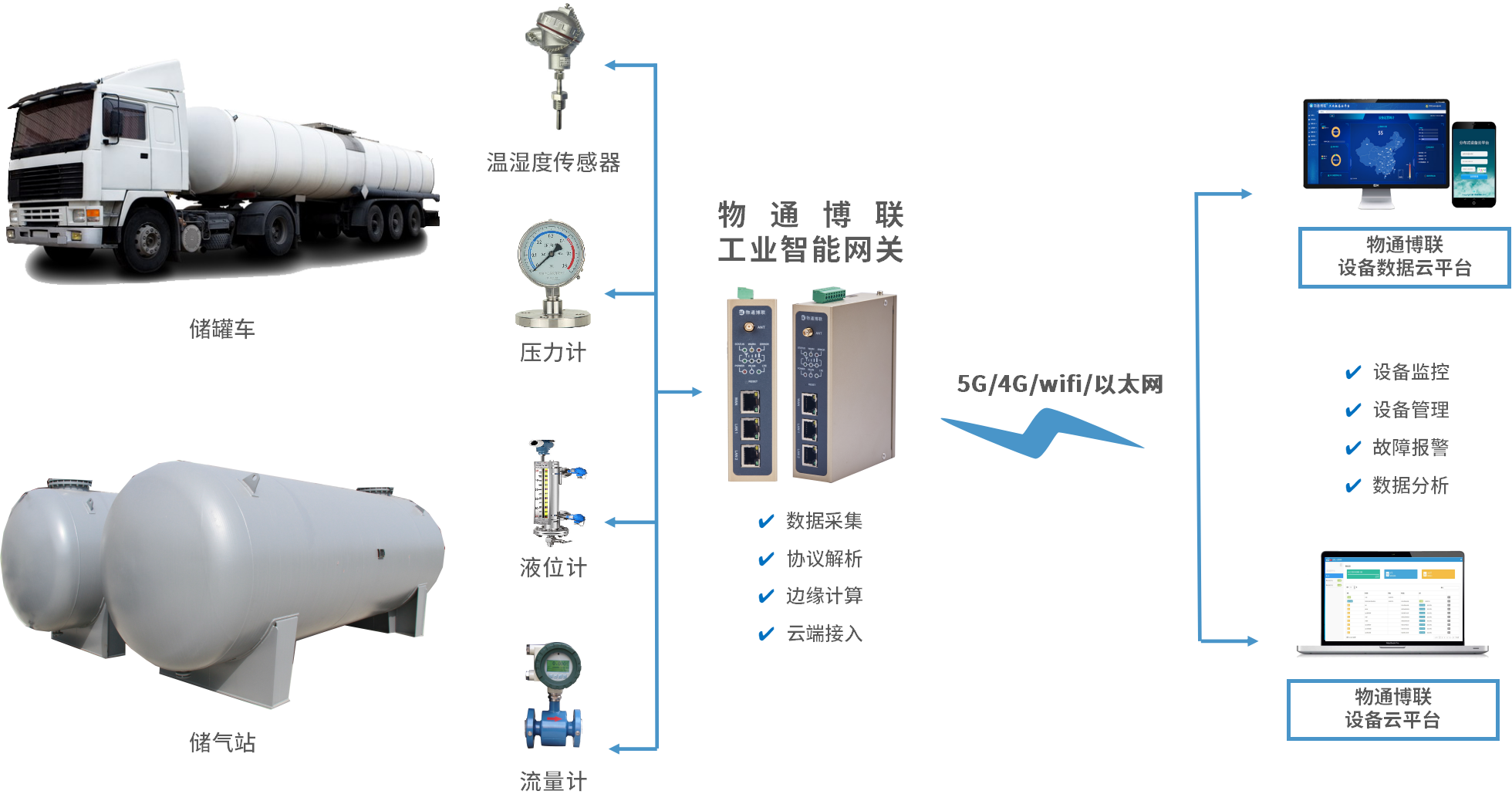 long8龙8国际工业网关采集温度传感器、压力计、液位计、流量计等设备数据并以5G/4G/WIFI/以太网等方式上传到设备远程运维管理平台。顺利获得云平台实现对液位、压力、温度、流量等数据的在线监测,并实现设备运行监控、远程管理、故障报警等功能,进而判断燃气输配设备的工作状态,保证燃气输配设备的安全稳定运行,有力支持燃气输配的安全管理工作。