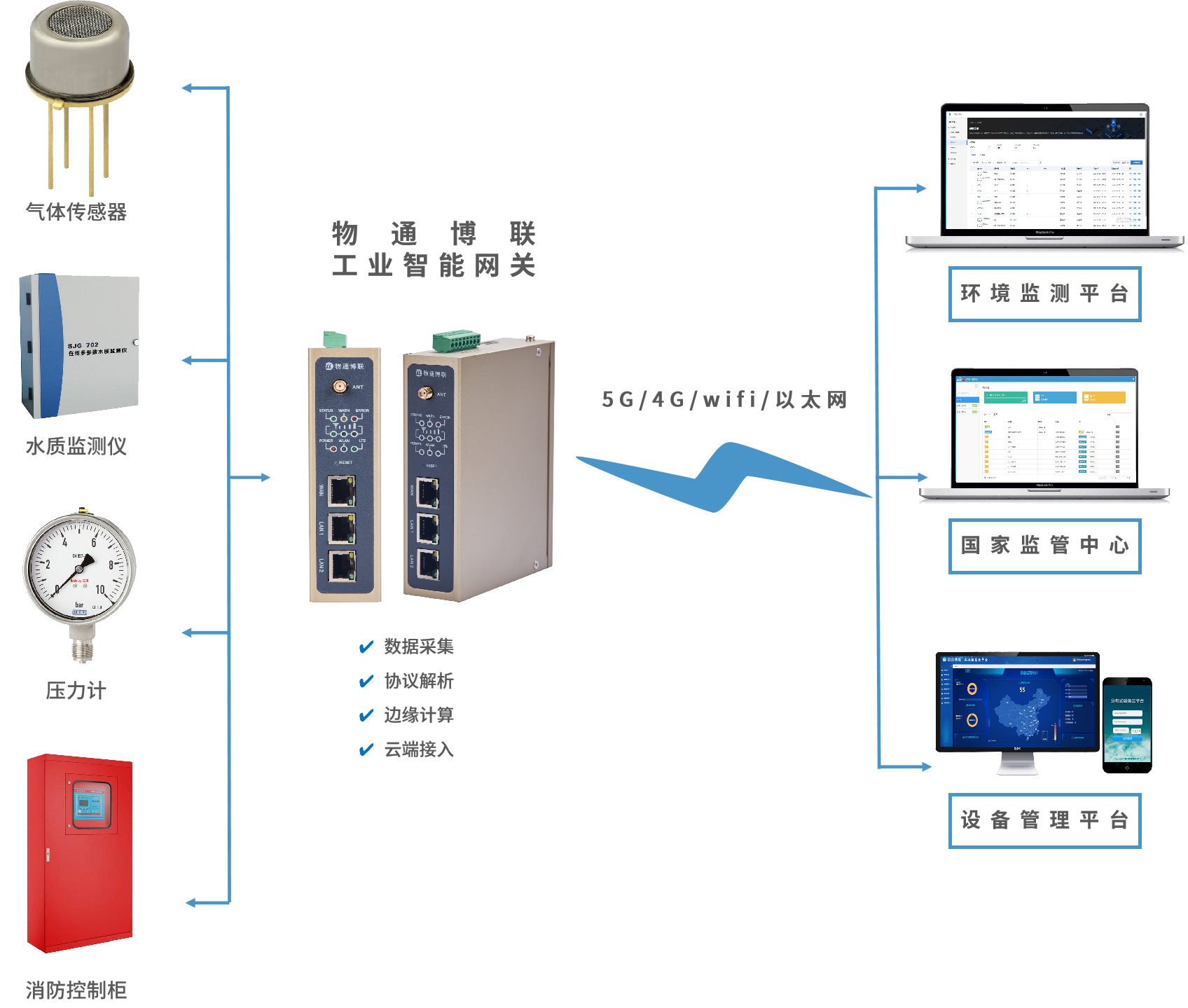03 解决方案 long8龙8国际的推出环境监测安全预警系统,将工厂内的危险气体传感器、废水监测仪、管道压力计及消防控制柜PLC接入到工业智能网关中,由工业智能网关采集各项环境参数和设备数据并上传到上位机或云平台进行监控和展示,进而实现工厂现场和国家监管中心的联动监管和实时控制,保证现场环境安全稳定和可控。