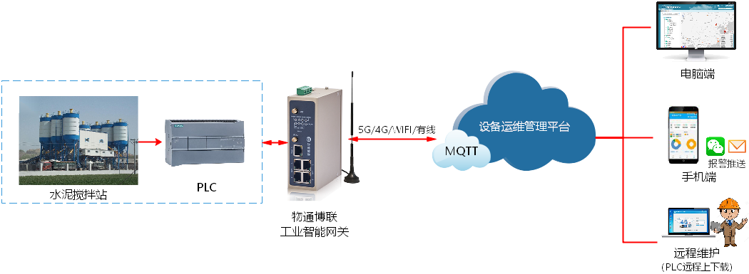 03 解决方案 long8龙8国际推出的工业智能网关可以接入水泥搅拌机控制器PLC内进行实时数据采集和数据通信工作,实现搅拌机运行状态和工艺参数的可视化远程监控,并顺利获得智能报警规则快速创建运维工单并派发到维护人员手中,实现设备远程控制、远程维护、数据分析等功能。 同时,工程师可以借助设备维护快线对异地PLC进行远程编程调试和远程上下载程序等操作,从而有效提高工作效率、减少运维成本,打造优质高效的售后运维服务。
