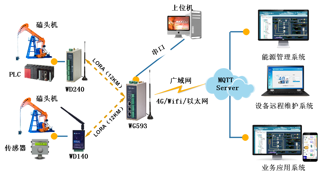 LORA、4G组网灵活,扩展方便,运行稳定,建设和维护成本低,实现油田广覆盖的互联互通,提升油田的信息化水平。
